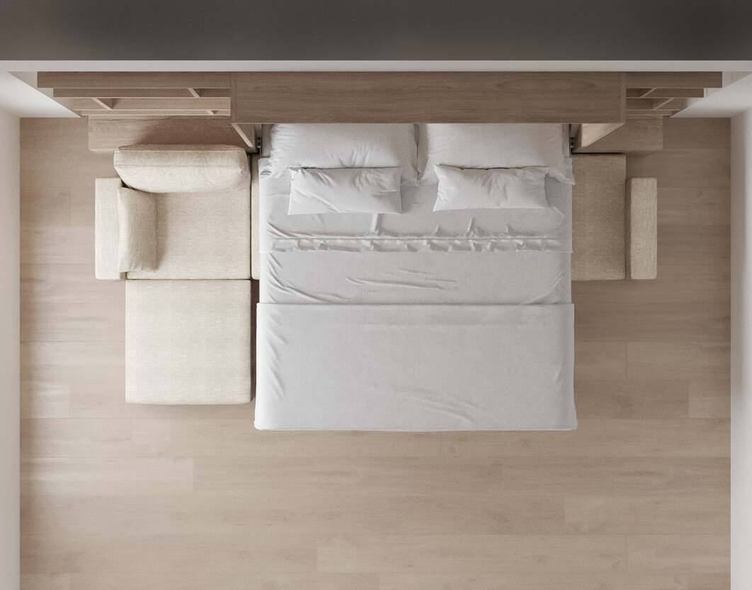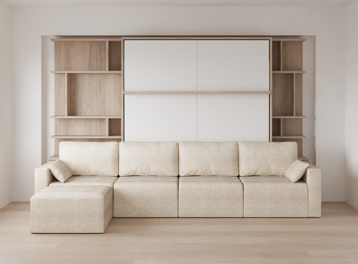 Royal King Murphy Bed with Sectional Sofa and Bookcases