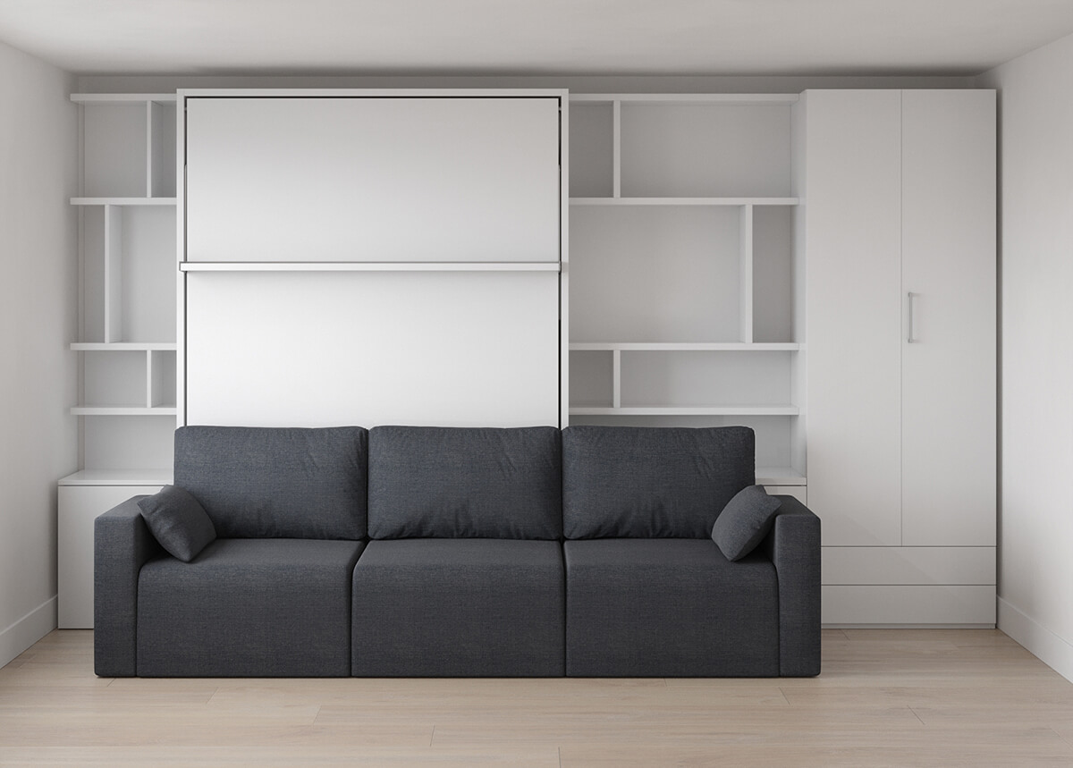 ROYAL Queen Wall Bed with Sectional Sofa and Bookcase