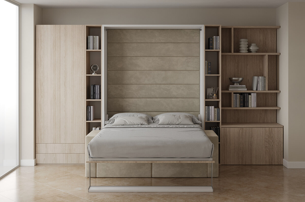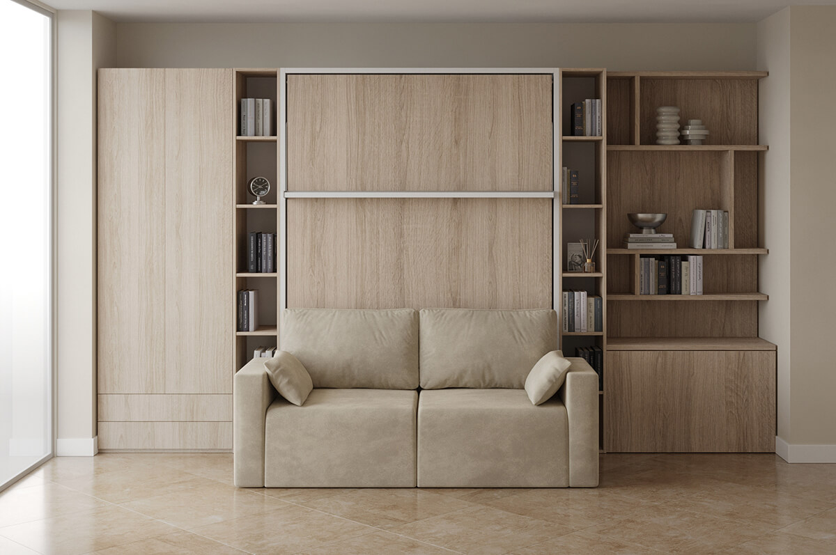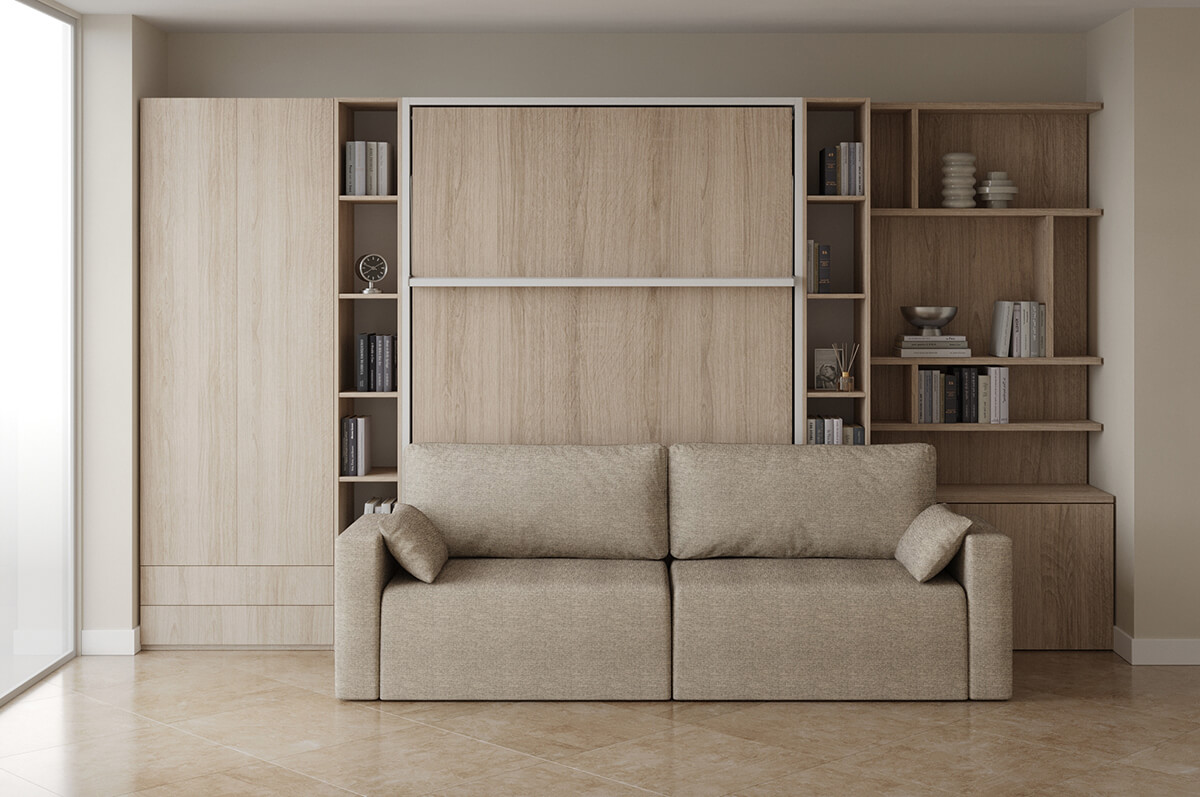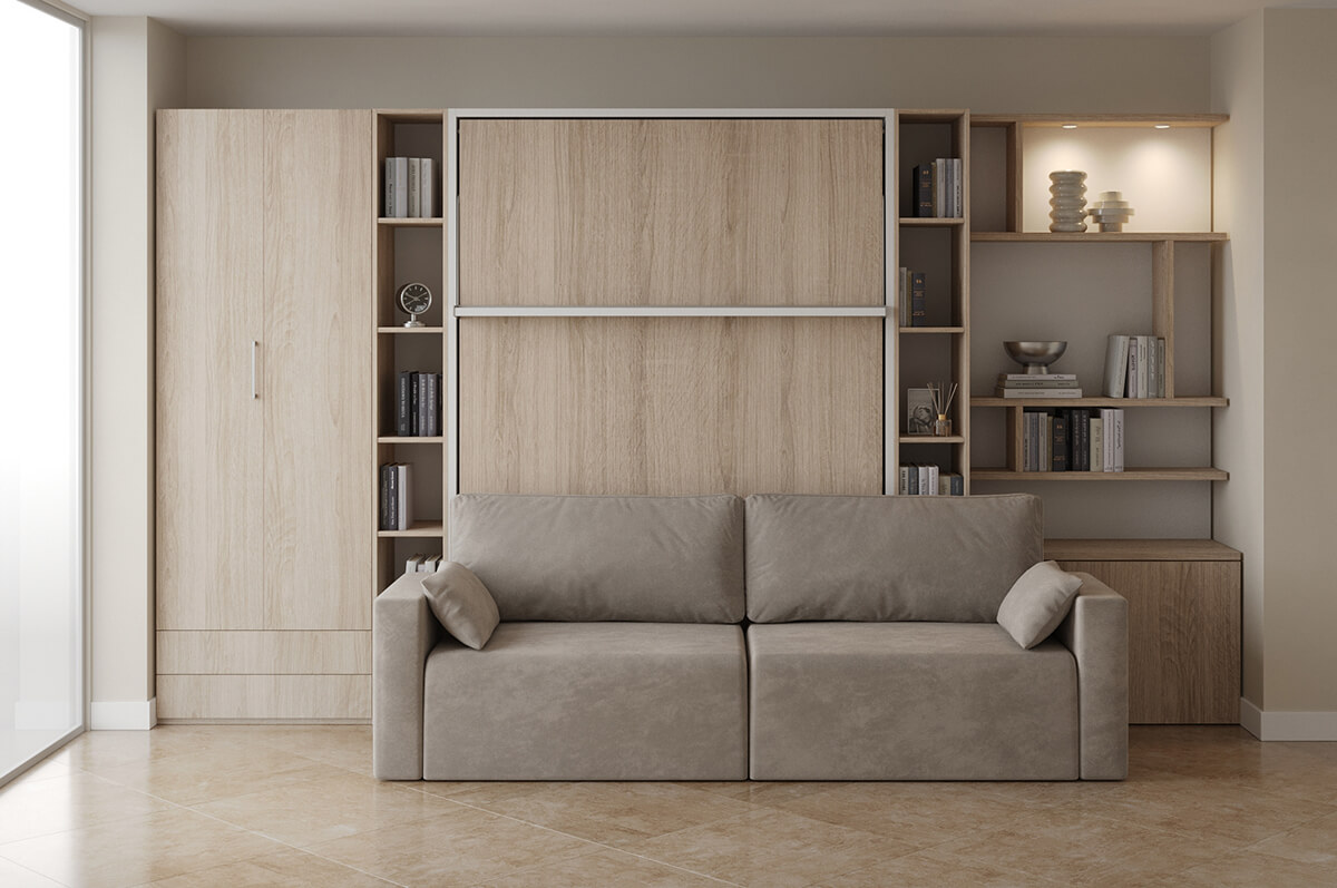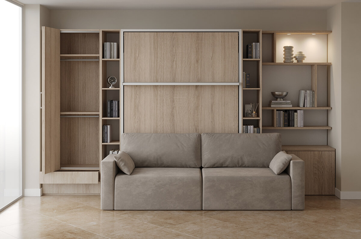 ROYAL Queen Wall Bed with Sectional Sofa and Bookcase Set