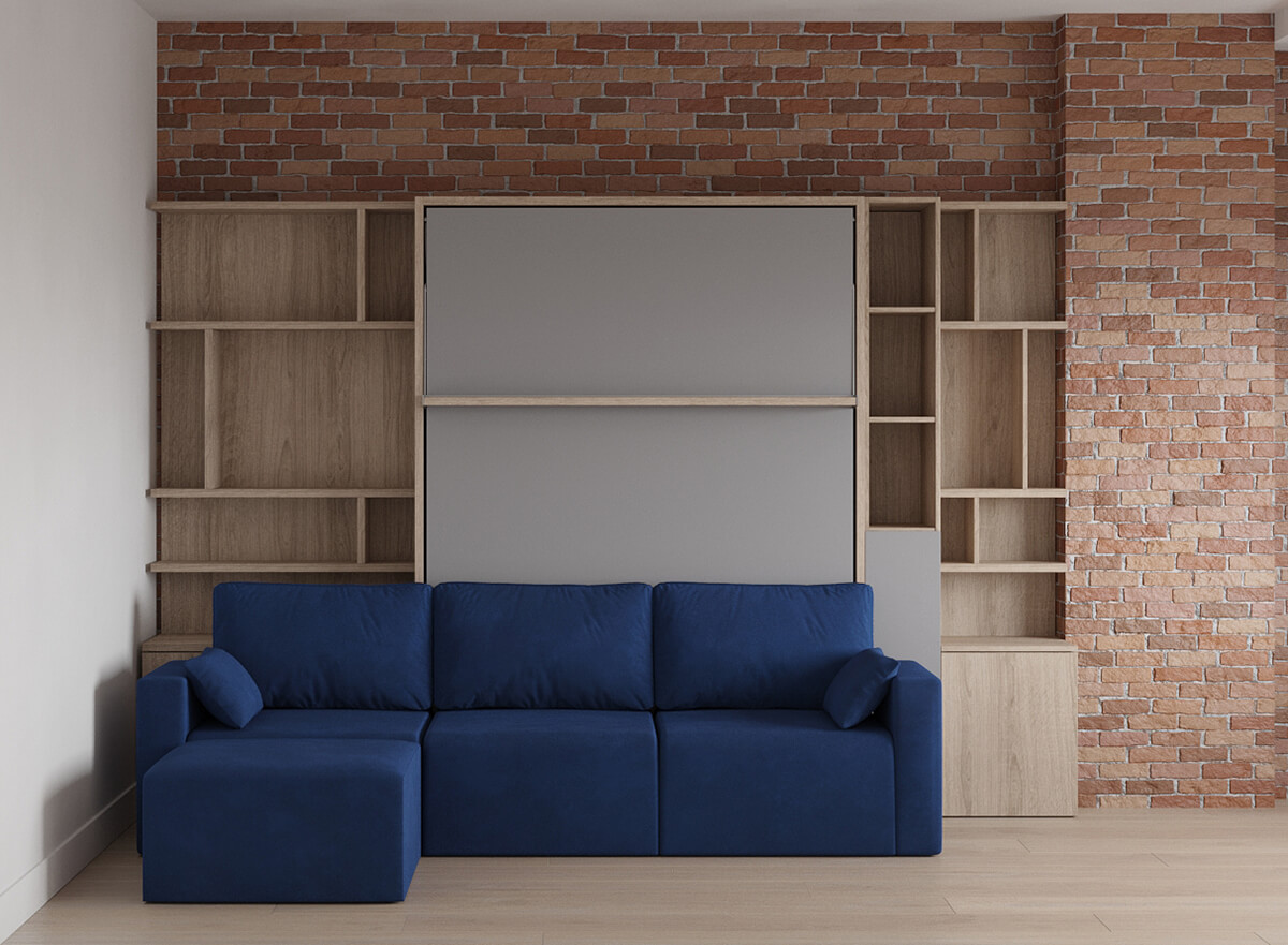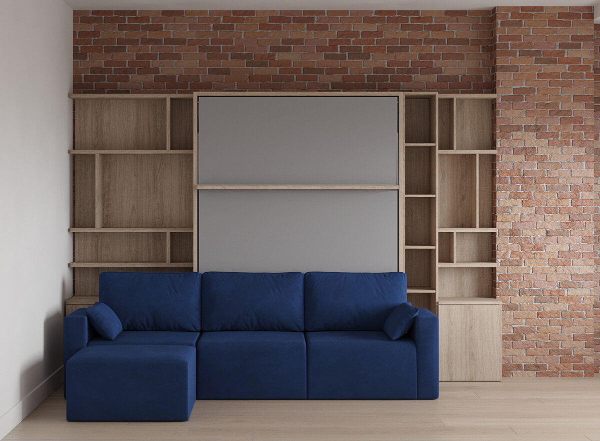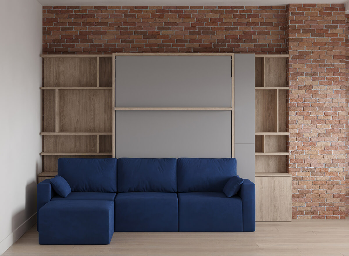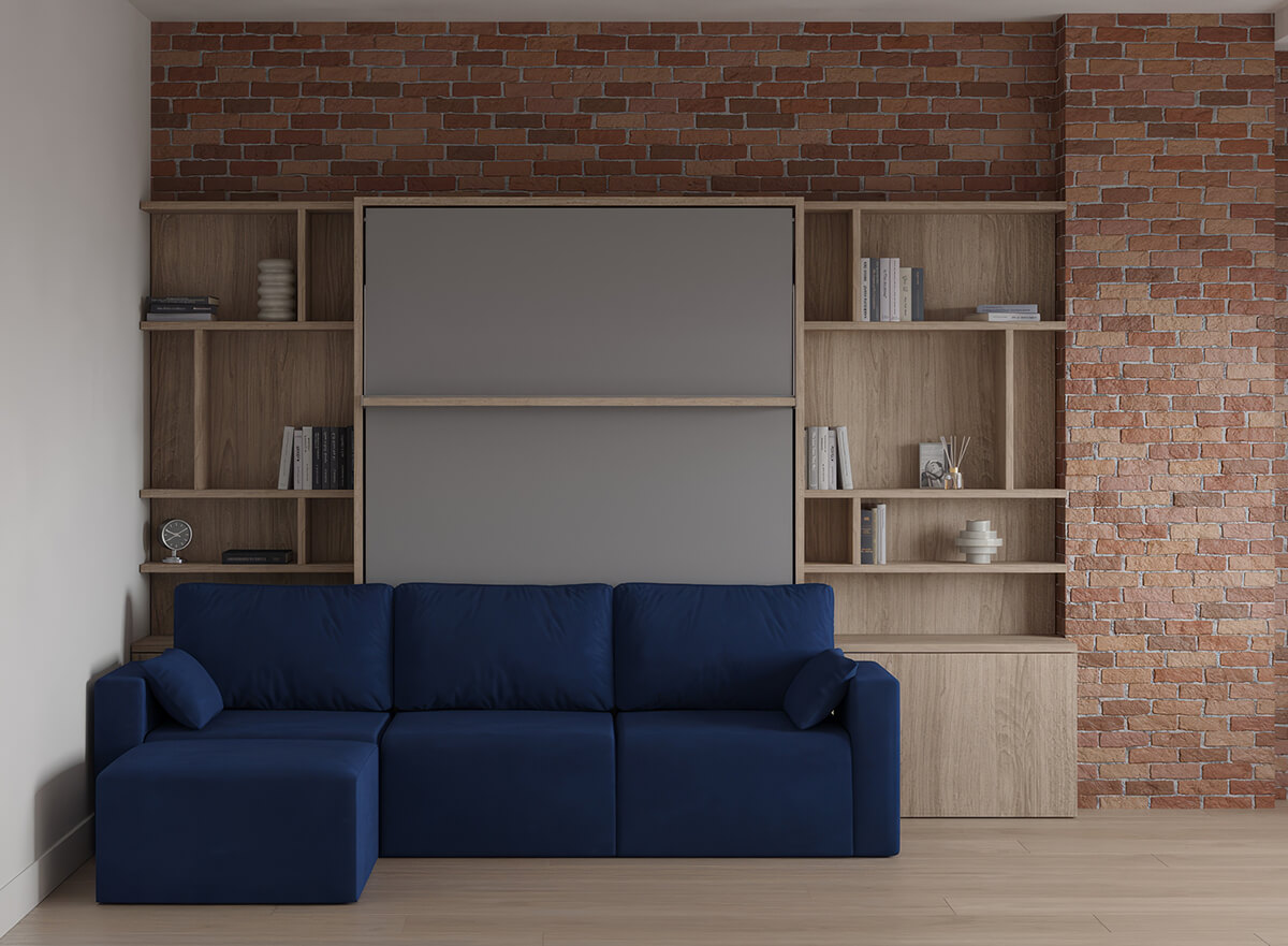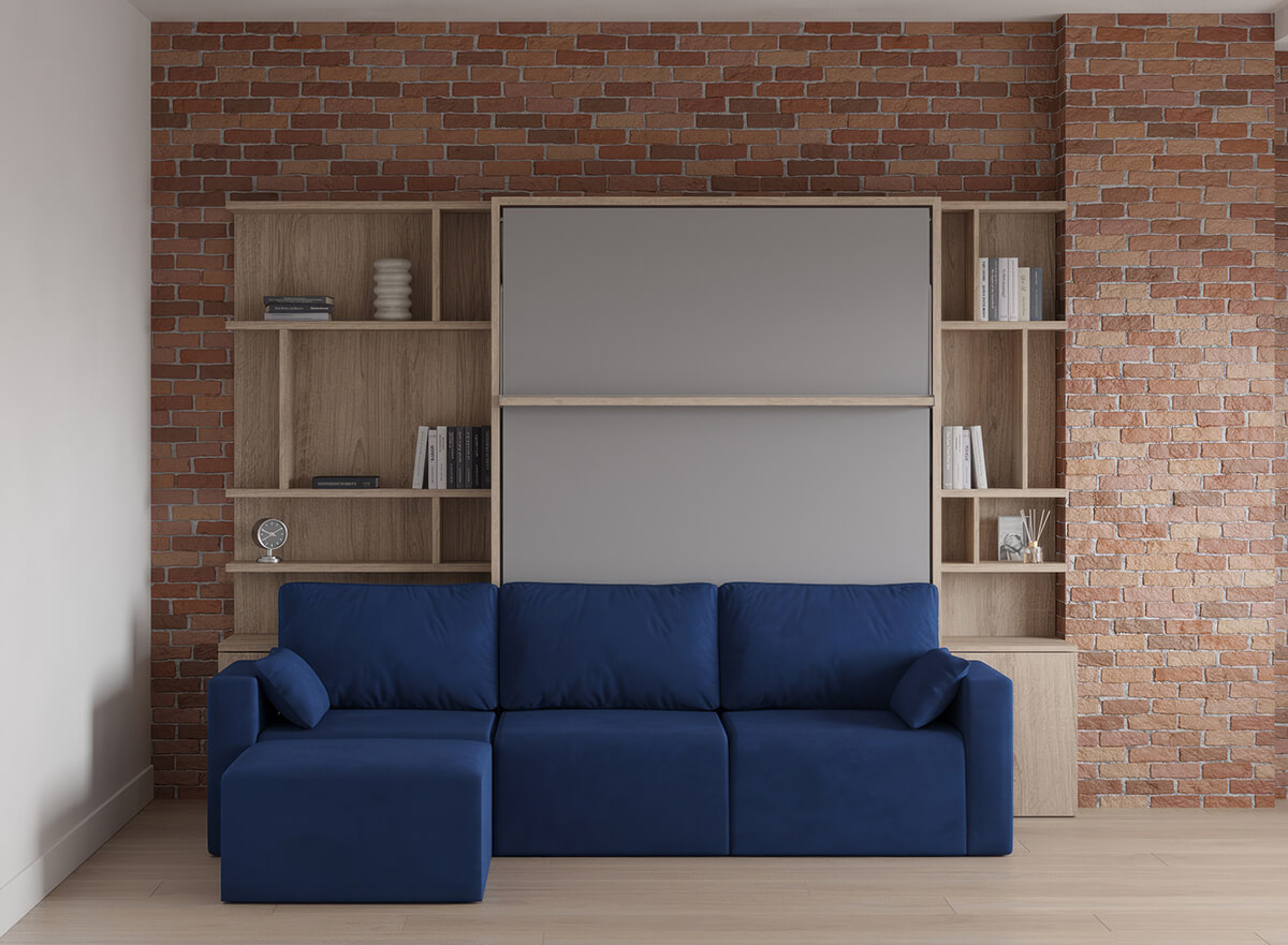 Royal Queen Wall Bed with Sectional Sofa and Bookcase Set