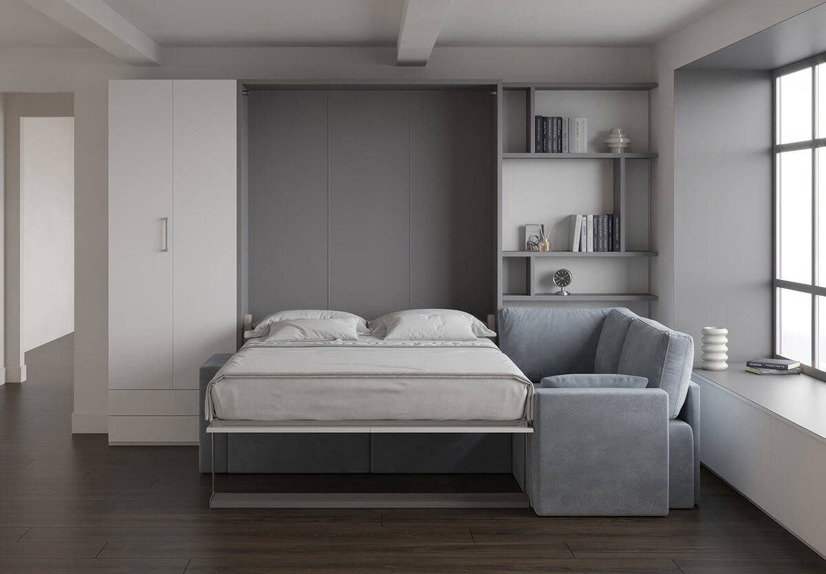 Royal Queen Wall Bed with Sectional Sofa, Wardrobe and Bookcase