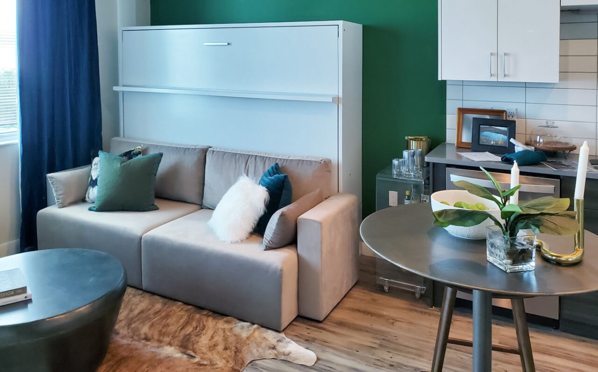 This industrial loft was in desperate need of a space-saving solution for seating and a queen size bed. To keep an open feel of the space we considered both vertical and horizontal queen size wall beds with an integrated 2-seat sofa.
