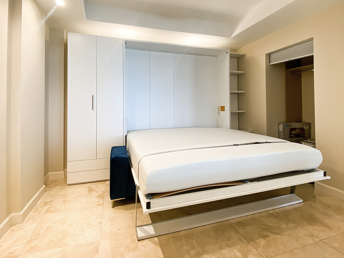 Experience ultimate functionality with the Royal King Murphy Bed featuring a sectional sofa, wardrobe, and bookcase set. This all-in-one design combines luxurious sleeping arrangements with stylish seating and ample storage options. Ideal for maximizing space in large rooms, it offers a sophisticated and practical solution for modern living.
