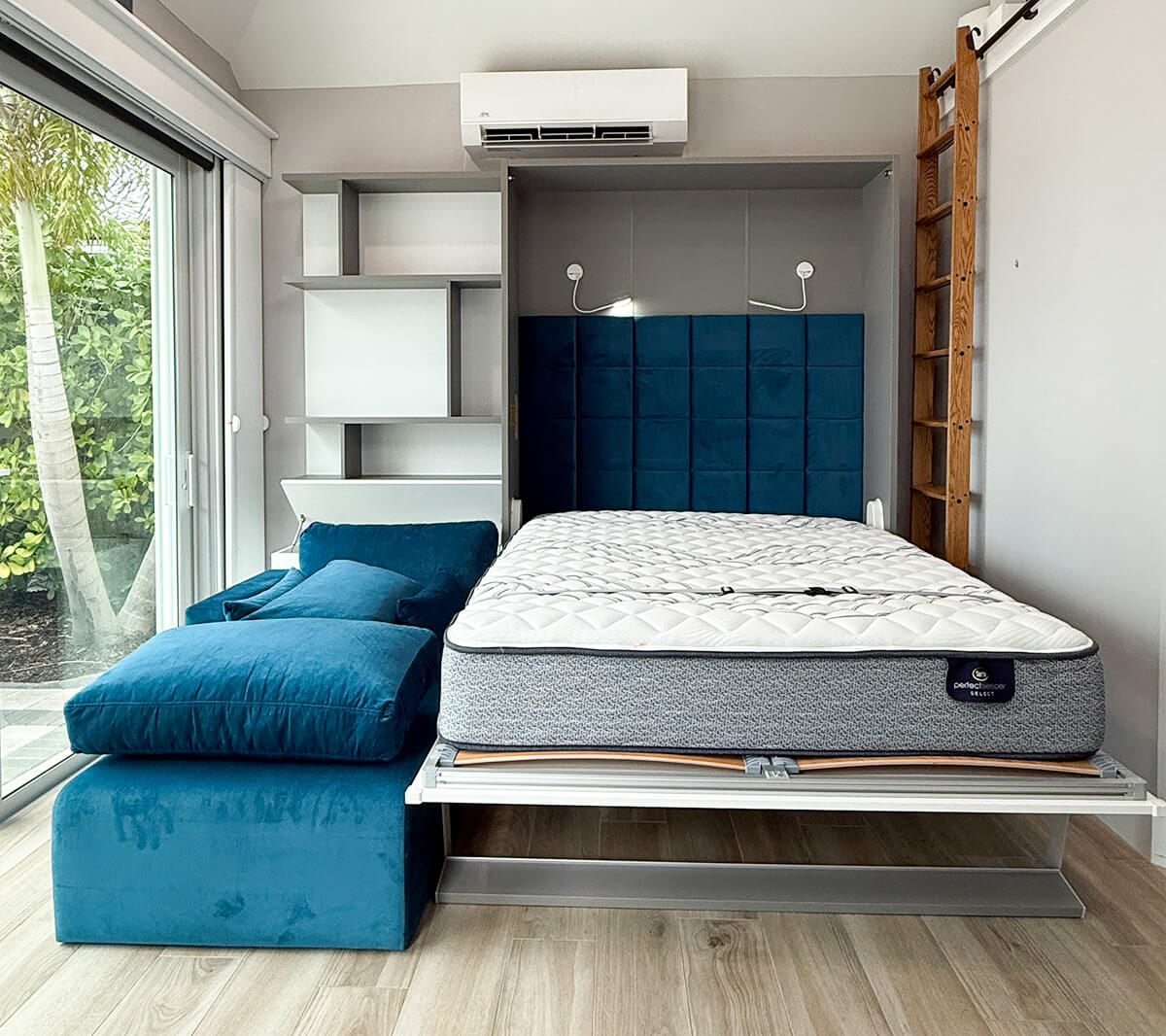 ROYAL Queen Wall Bed with Sectional Sofa and Bookcase