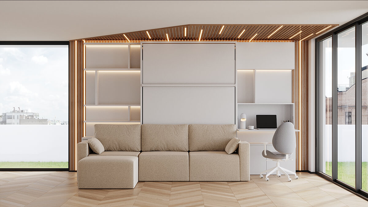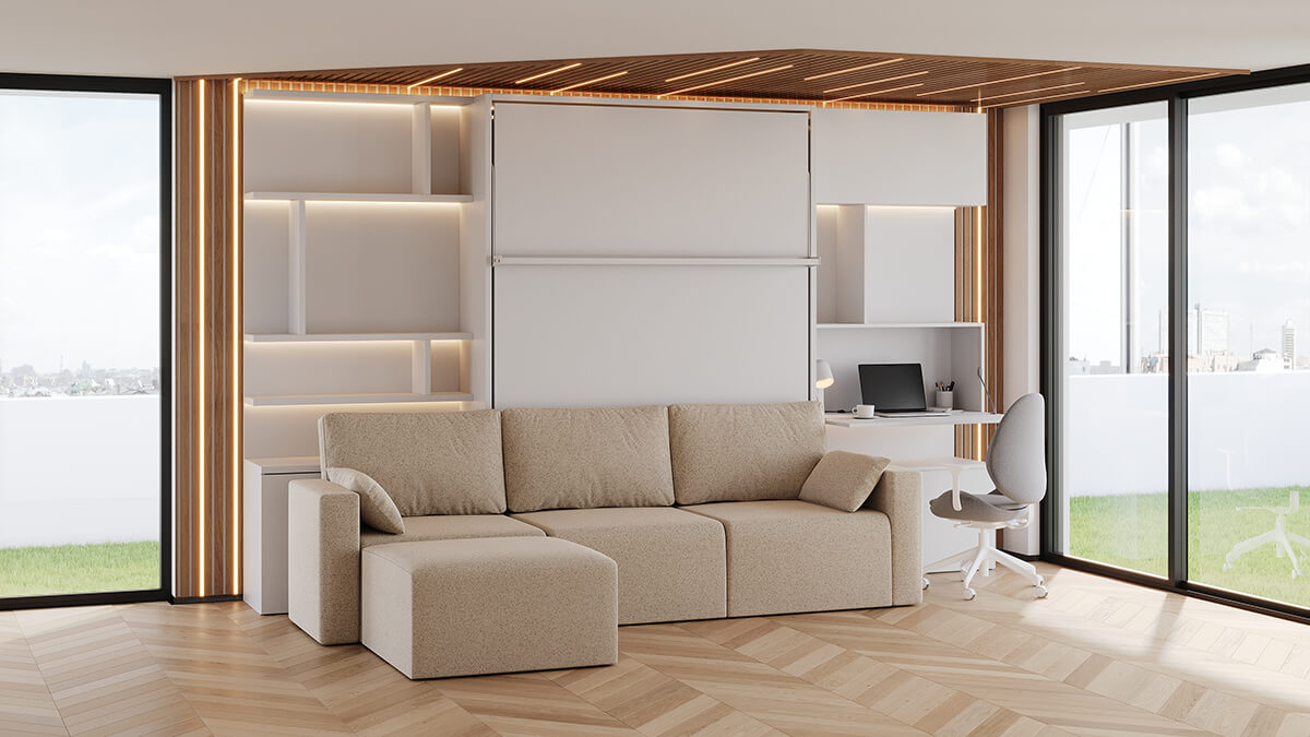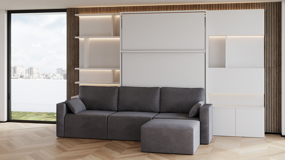 ROYAL Queen Wall Bed with Sectional Sofa, Wardrobe and Bookcases